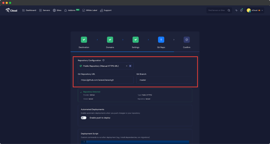 In the โGit Repoโ tab, you will find three repository options: ‘Private Repository (Manual SSH URL)โ, โPublic Repository (Manual HTTPS URL)โ, โConnected Git Providerโ.