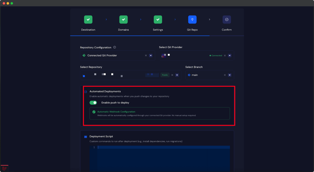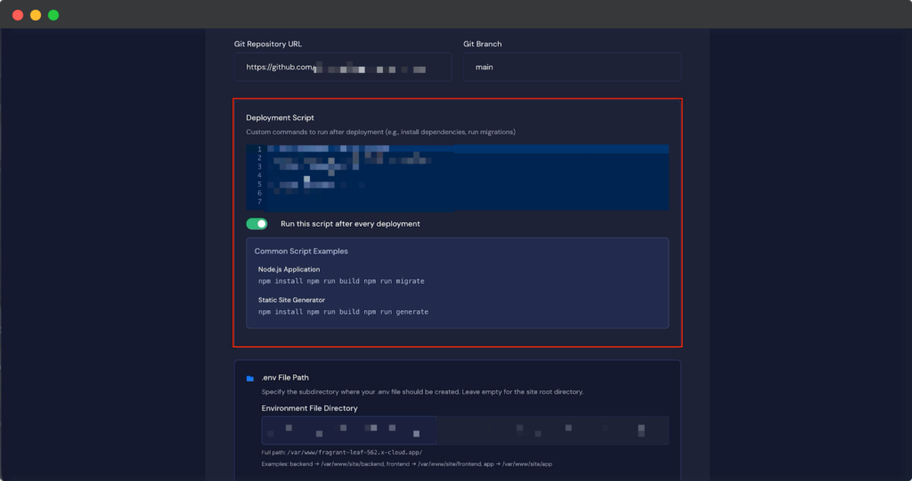 In the โDeployment Scriptโ field, enter any custom commands you want to execute after deployment.