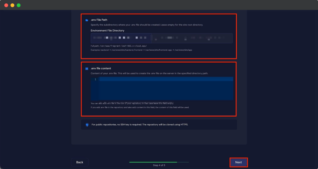 Next, you can specify the subdirectory where your .env file should be created in the โ.env File Pathโ field. You can also enter the contents of your .env file in the โFile Contentโ field.