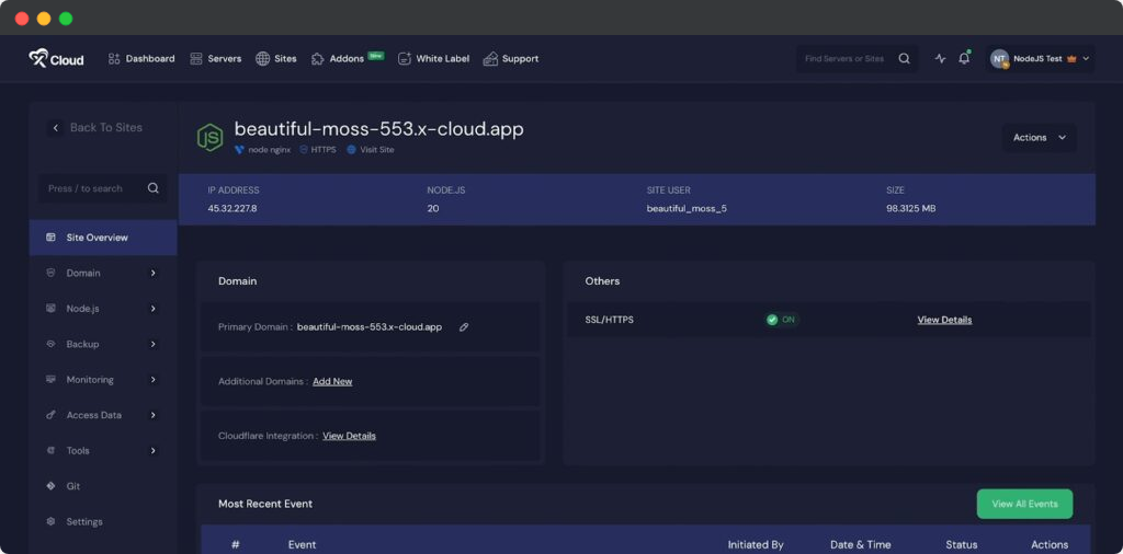 After deployment, a success message will appear. From there, access your site dashboard and visit your site to confirm your Node.js app is running on Vultr server with xCloud.