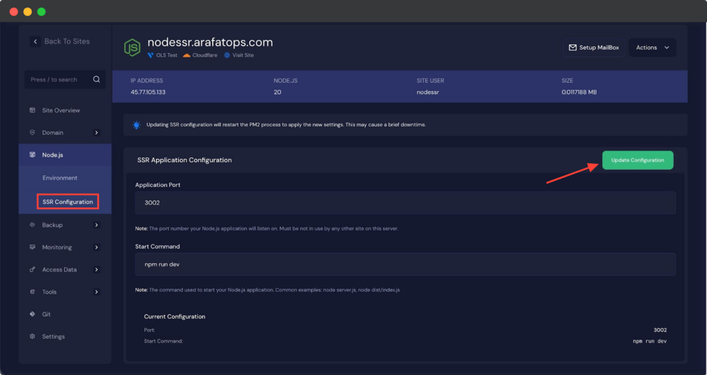 Just go to the โSSR Configurationโ from the โNode.jsโ Menu under the site dashboard and click on the โUpdate Configurationโ button.