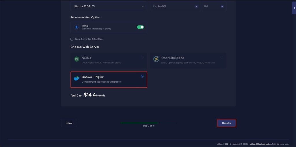 Next, you can see the โDocker + NGINXโ stack is already selected, which is mandatory for deploying the Supabase application. Then click on the โCreateโ button to proceed.