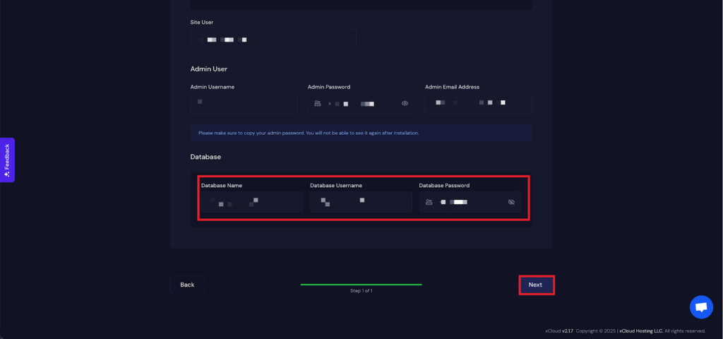 Next, get the โDatabase Nameโ, โDatabase Usernameโ and โDatabase Passwordโ for this application and click on the โNextโ button.
