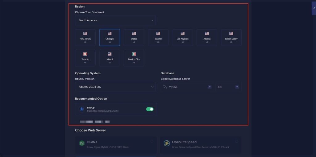Next, choose the โRegionโ and โUbuntu Versionโ for your server. You can also enable or disable the Backup option as needed.