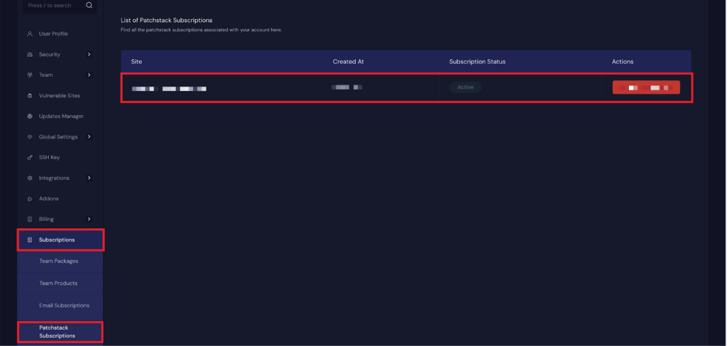 To view or manage your Patchstack Site Security PRO subscription Go to Team Settings โ Subscriptions. Click on Patchstack Subscription. Here you can view active subscriptions, renewals, or cancel if needed.