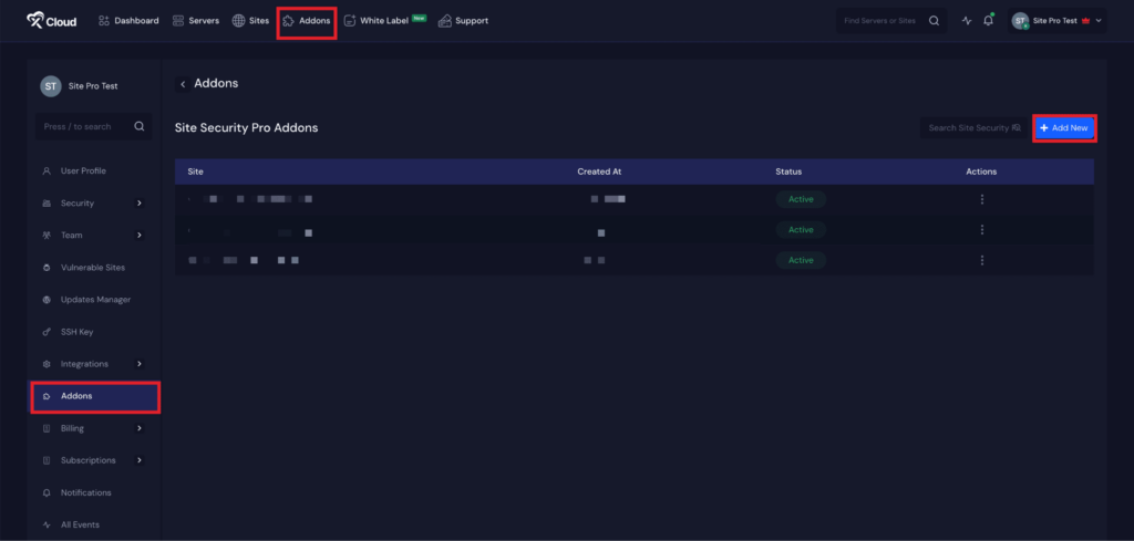 You can go to the โAddonsโ page from the dashboard. Here you will see the sites that are subscribed to the Site Security PRO. Here you can subscribe to new sites for Site Security PRO. Also, remove the subscription for any site and manage the sites.