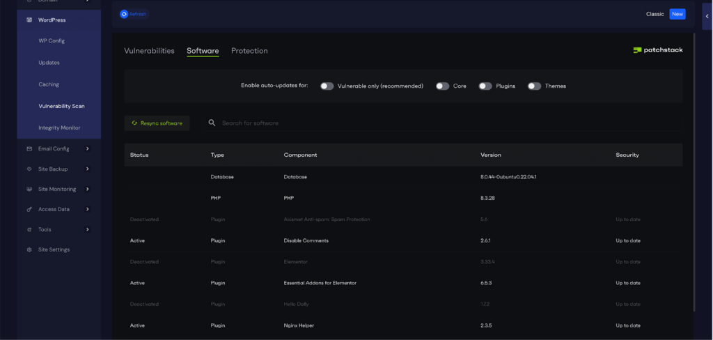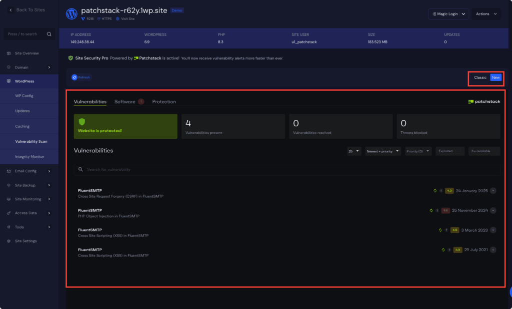 Site Security PRO Powered by Patchstack is an advanced WordPress vulnerability detection and protection system offered as an xCloud addon. It gives you proactive defense against security issues in plugins, themes, and core files, including early alerts, automated virtual patching, and real-time threat monitoring.