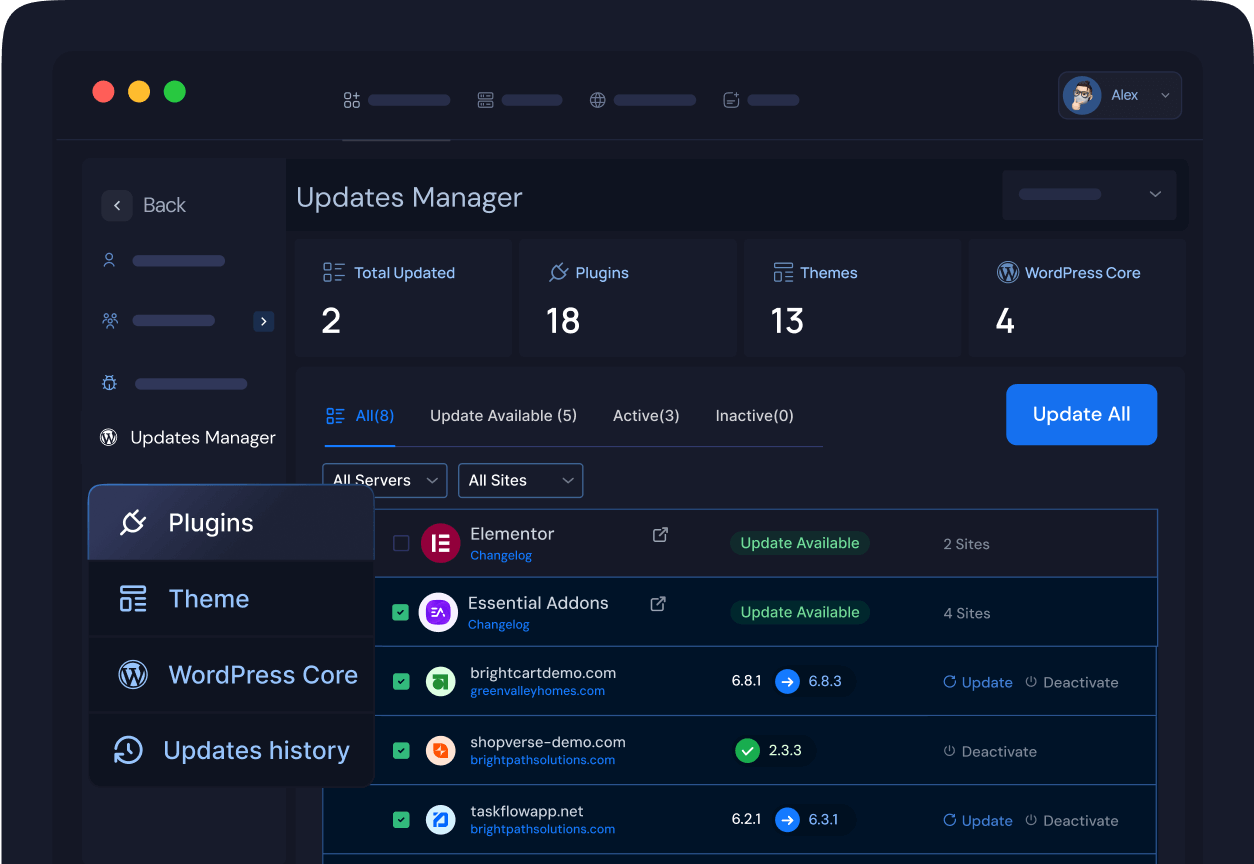 Easily activate, update, or roll back plugins and themes. You can also update them in bulk with a single click, simplifying the process and keeping your site always up to date.