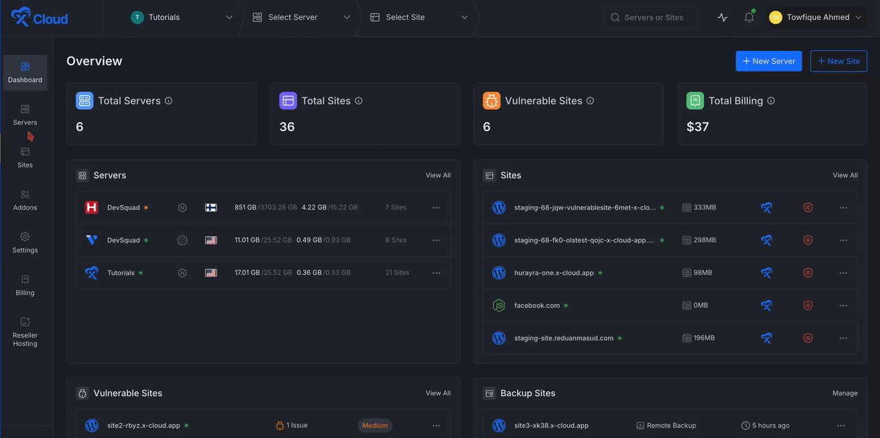 From the main dashboard, you can quickly view your latest servers and sites, recent vulnerable sites, backup status, and billing overview – all right from the start.